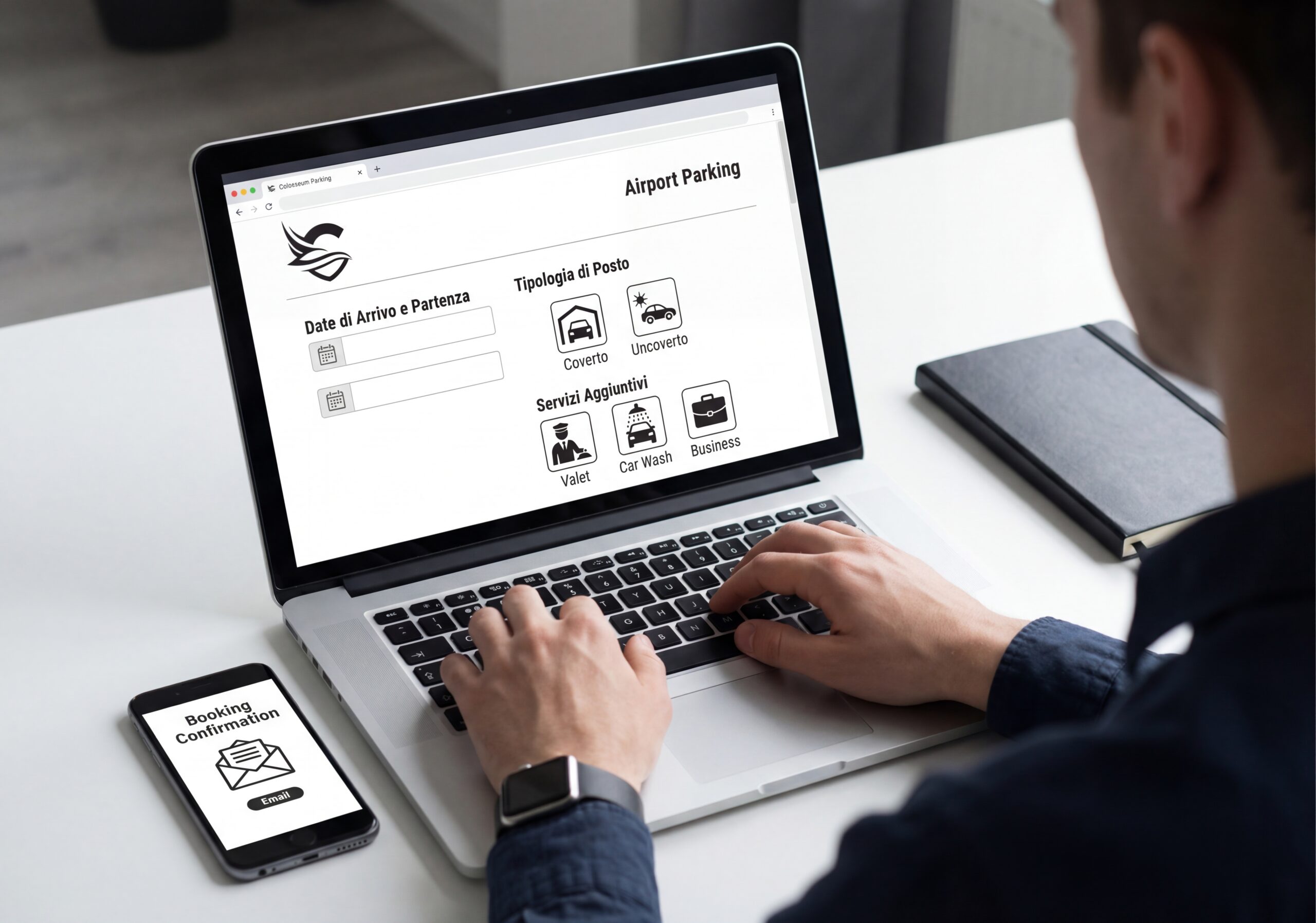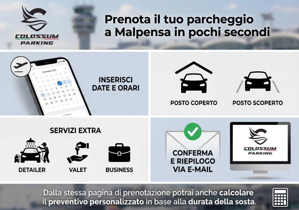 Che tu parta per lavoro o per vacanza, con Colossum Parking puoi prenotare online il tuo parcheggio a Malpensa in maniera semplice e veloce: