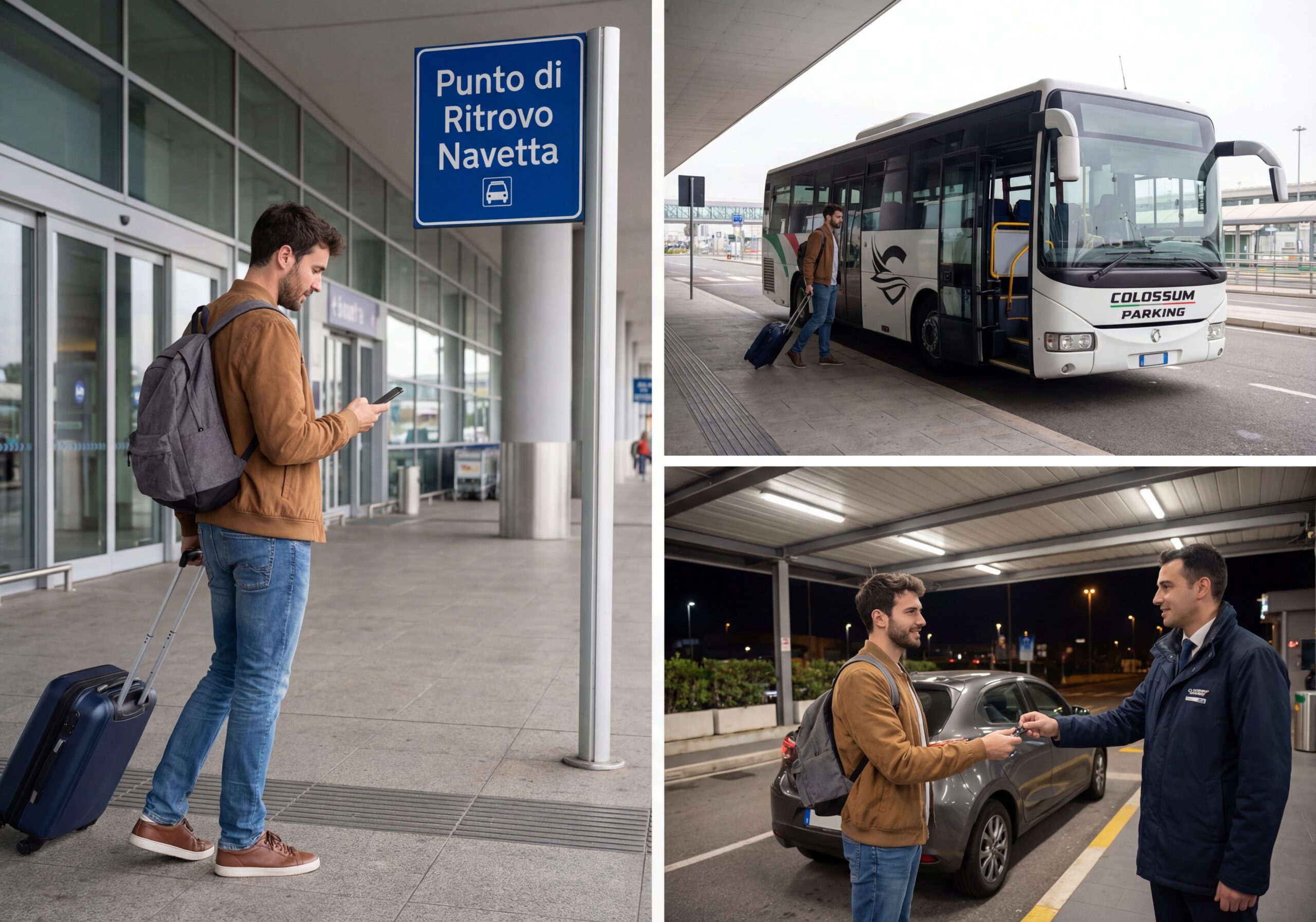la navetta Colossum Parking ti riaccompagna al parcheggio, dove troverai l’auto pronta per il rientro.